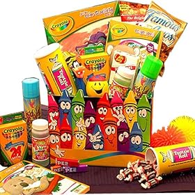 Ingredients: Crazy Crayons Gift Box; Crayola Coloring & Activity Book; Crayola 24 Piece Crayon Set; Jelly belly Jelly beans 20 Flavor Box; Pez Candy Dispenser with Candy; Crazy String; Gourmet Chocolate Chip Cookies; Cracker Jacks Caramel Popcorn with Surprise; Tootsie Roll Candy; Bubbles with Blower Wand; and Relaxable Smiley Face Ball